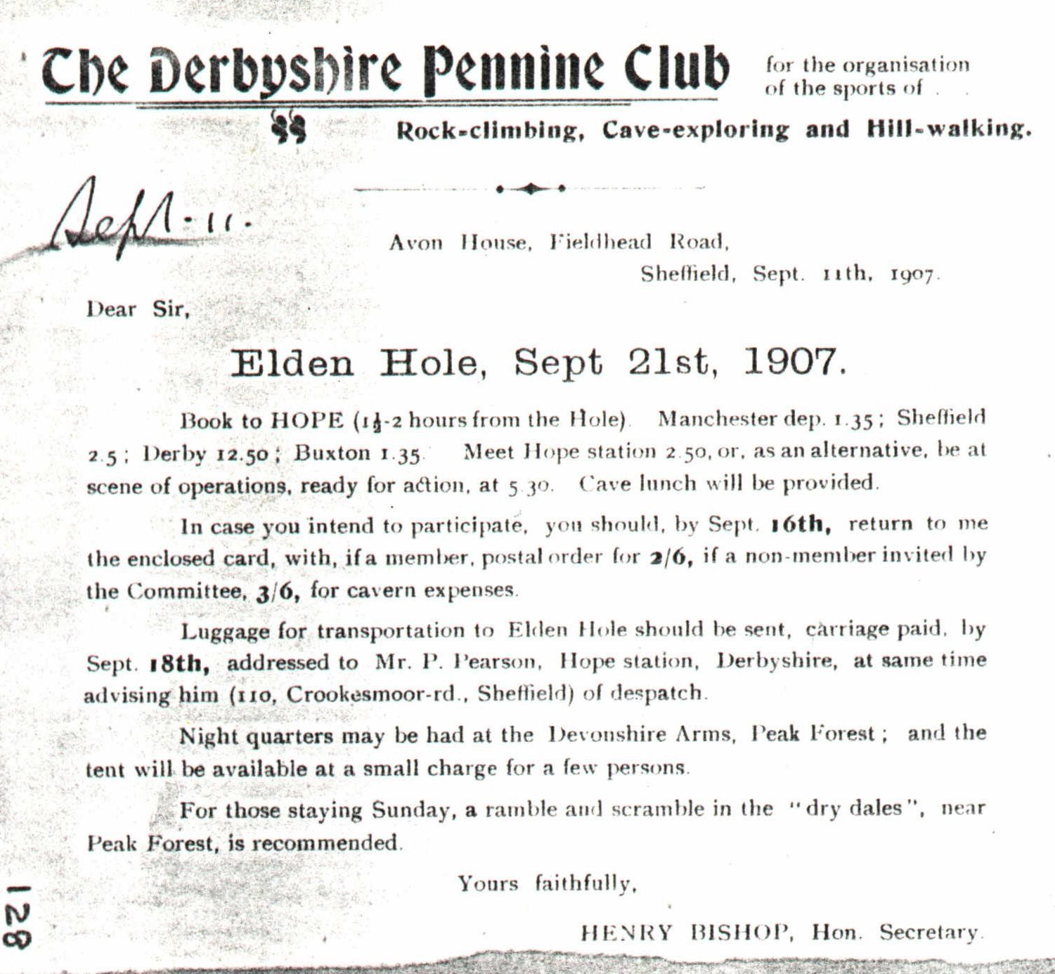 I descended the above on September 21 1907 with the Derbyshire Pennine Club. Operations started at 3.30 and 20 turned up. The ‘Bosuns Chair’ was the descent chosen and a telephone was fitted so as to keep in touch with persons down below. I descended at 9pm.