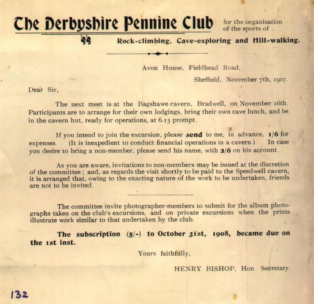 On November 16th, 1907, thirteen members and friends spent a most enjoyable evening in the Bagshawe Cavern, Bradwell. Some surveying was done on the upper level, and later, a most fascinating and but rarely visited fissure below the Dungeon was examined. This is known as the Birdcage, or Bird Cave, and is chock full of beautiful calcine formations. During the evening, rain fell very heavily over Bradwell, and was responsible for the hurried retreat of three bold men who had penetrated some 150 feet into a water passage, or syphon, at the end of the upper level. In a very short time the water market rose rapidly, in sympathy with the reports of heavy rain crops – to borrow Stock Exchange phraseology – and our friends saw that their avenue of retreat might be turned into a prison unless they bestirred themselves.