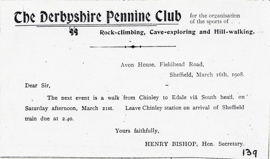 The afternoon’s walk over the moors, from Chinley to Edale, via South Head, on March 21st, was very attractive owing to the bracing air and crisp snow. Singularly enough, none of the members had previously done this walk in its entirety, and we were much pleased with the scenery, which was rougher than we had been led to expect. The novel views of the Downfall end of the Scout were a great feature of the walk. A ‘new and difficult’ ascent, of something under 10,000 feet, was accomplished immediately above the Edale rifle range. As firing was not in progress at the time, the only mishaps were those due to the lodging in various parts of our anatomy of spells from the ‘climb.’