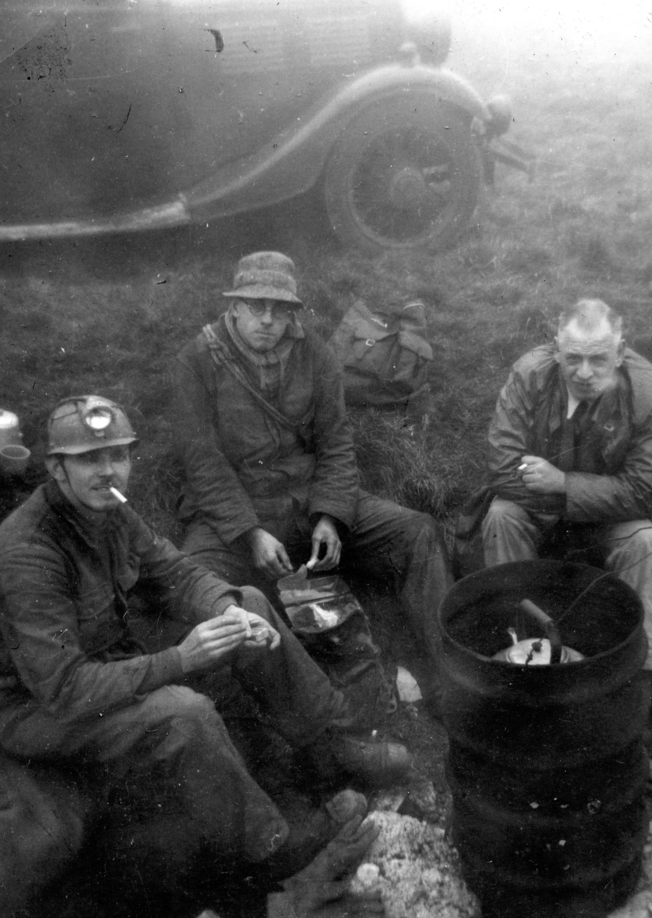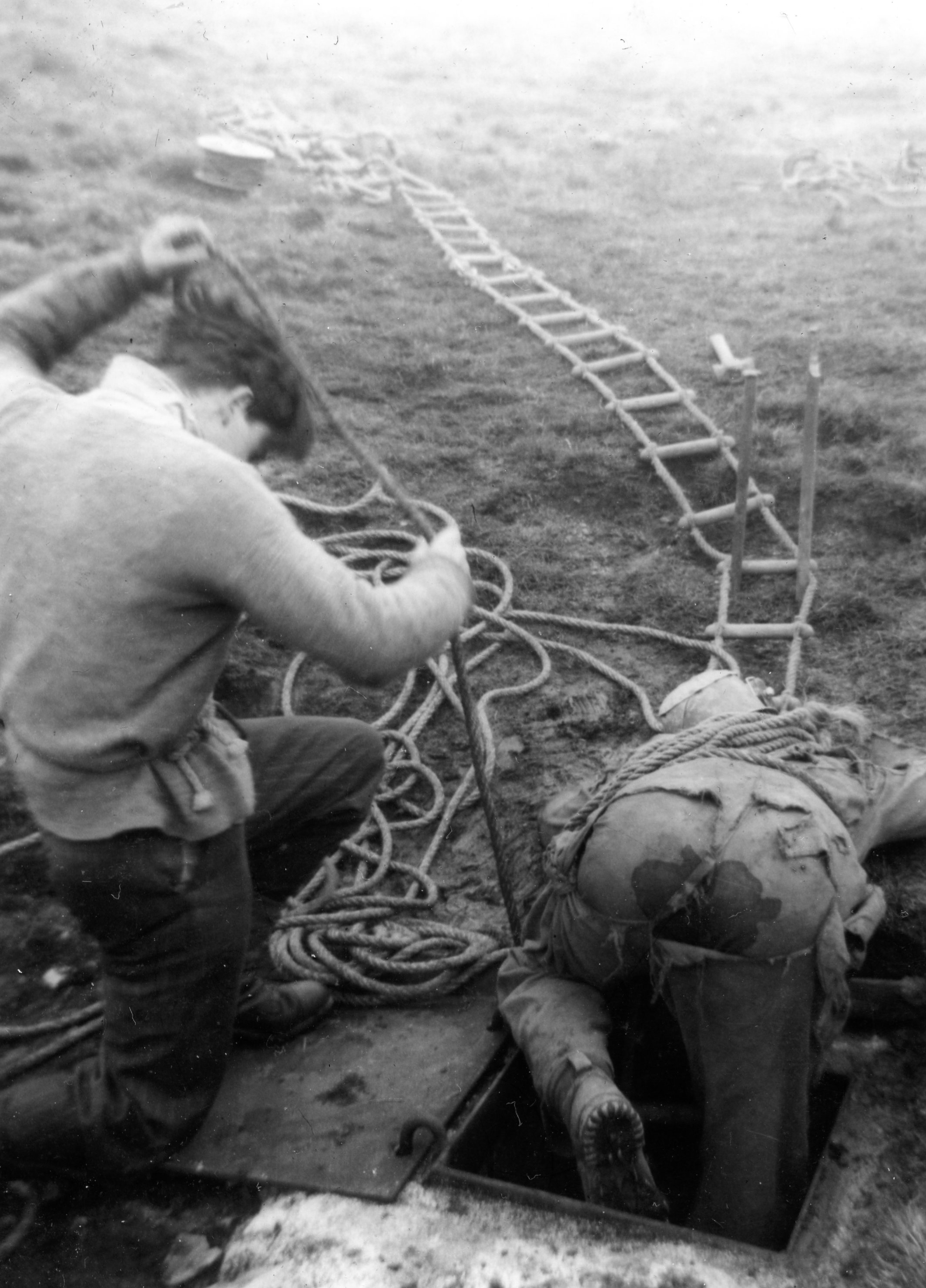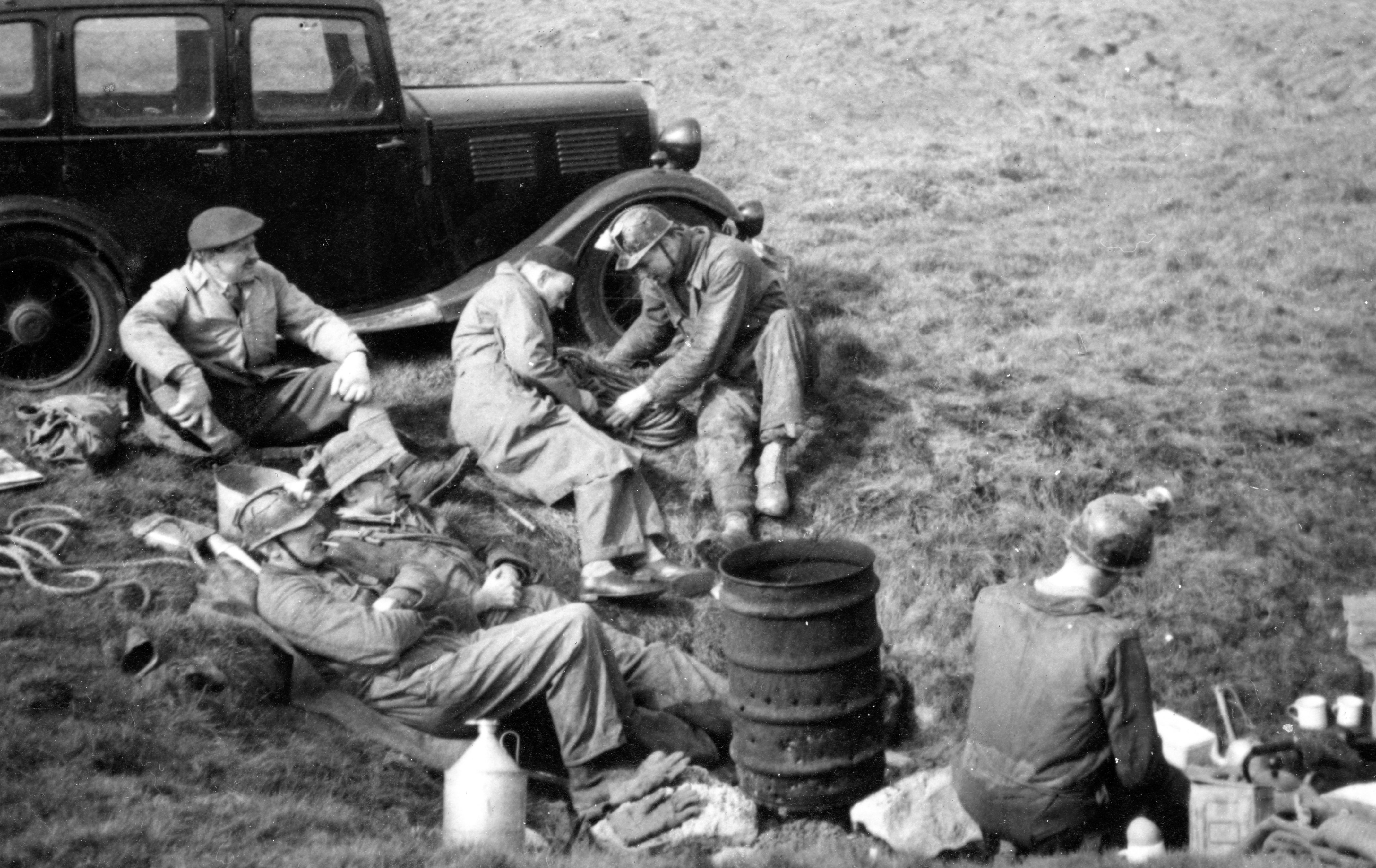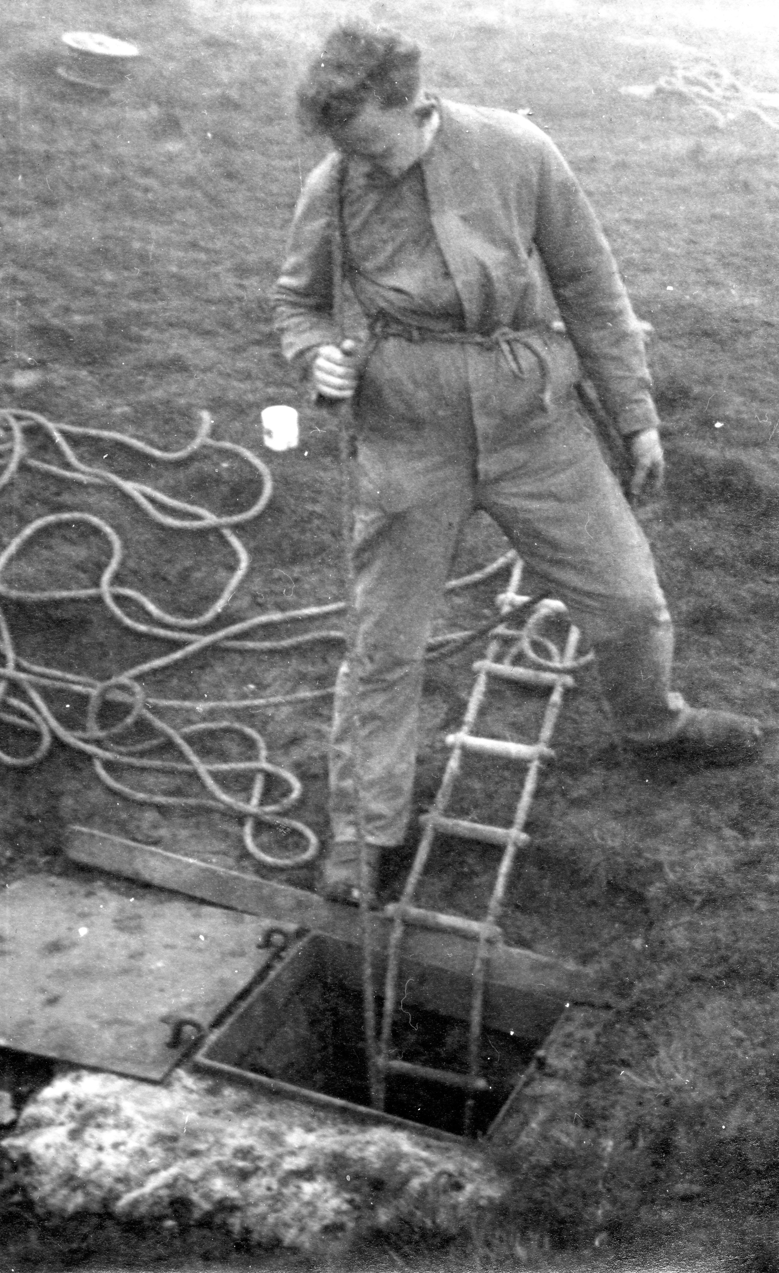 The hole being laddered, Davies went right to the bottom to give a report on the choke; Barnett stayed at the 100 feet stage and Pembury went down to him with the telephone, and work was started. Chantry came up for an hour or two and Sissons, Hide and Haythornthwaite arrived to strengthen the top party. Unfortunately, both Colley and Chantry had to leave early, but during their short visit they managed to burn nearly all the coke intended to last the whole day. Work went on all day, with people constantly either coming up or going down, Davies Carr, Pembury and Tiptaft all getting right to the bottom and doing useful work.