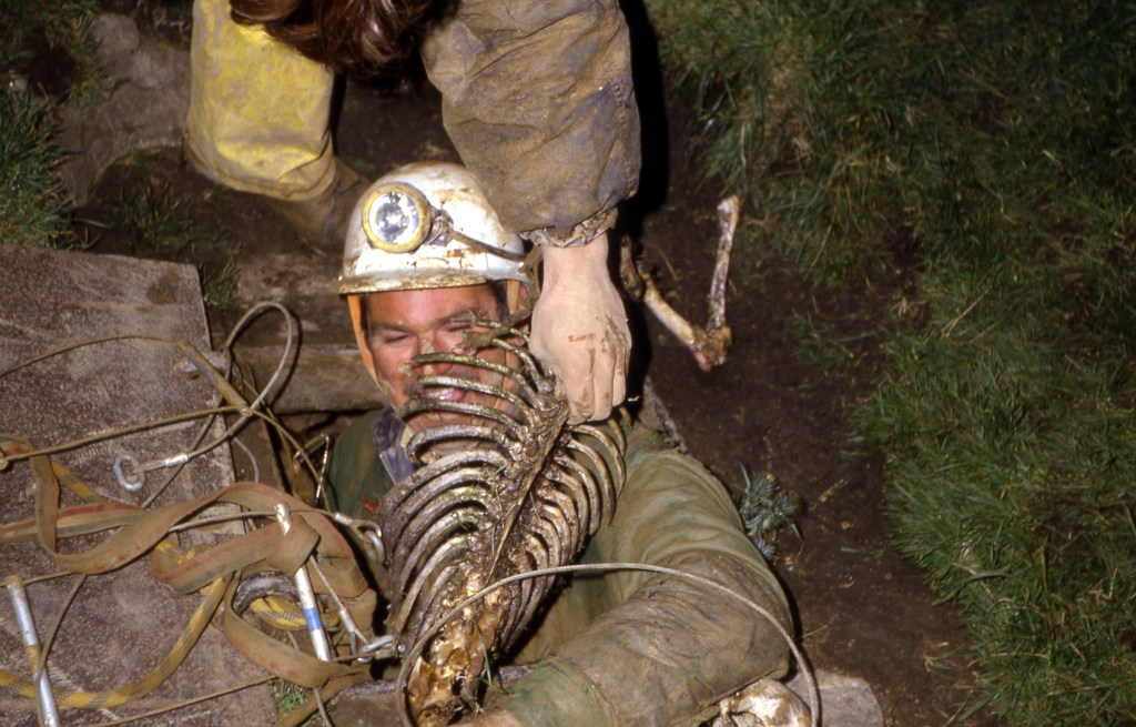 At the main pitch, the Narrows proved to be more awkward than anticipated. Movement was restricted, particularly in lifting up ones knees, and a great deal of effort was needed to propel oneself upwards. As the party finally emerged into daylight again some 7 hours later they were each greeted, in turn, by a leering white face. It was the skull of a dead sheep suspended by a wire belay. Across the entrance was the rib cage of the same beast, put there by Travis, as he guarded the entrance throughout the long day.