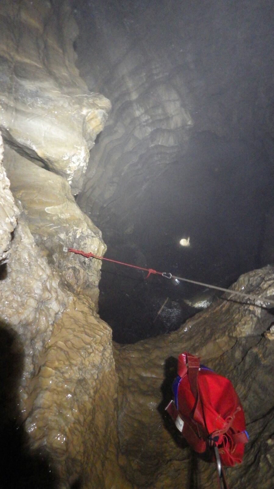 We wallowed, cursed and crawled our way through The Trenches, Liam’s Way and into Colostomy before the relief of Egnaro Aven appeared and we climbed down the ladders into the streamway. Kit was put on and Block Hall was ascended (always an impressive place and a fun ropey-dangly trip in it’s own right) and we regrouped before squeezing through into The Kingdom. We headed on ‘downstream’ with the intention of getting to the bottom of The Moosetrap and made it as far as the third pitch before realising some idiot had forgotten to bring any hangers. So around we turned and headed back up (all the while Sam having had his barrel chest trapped in the canyon section leading to the base of the first pitch). We wazzed down the pull-thrus to the Ventilator and back out, making it back to the hut in time for the meal. (Syd, Rob, Sam, Mike, McBain, Ed)