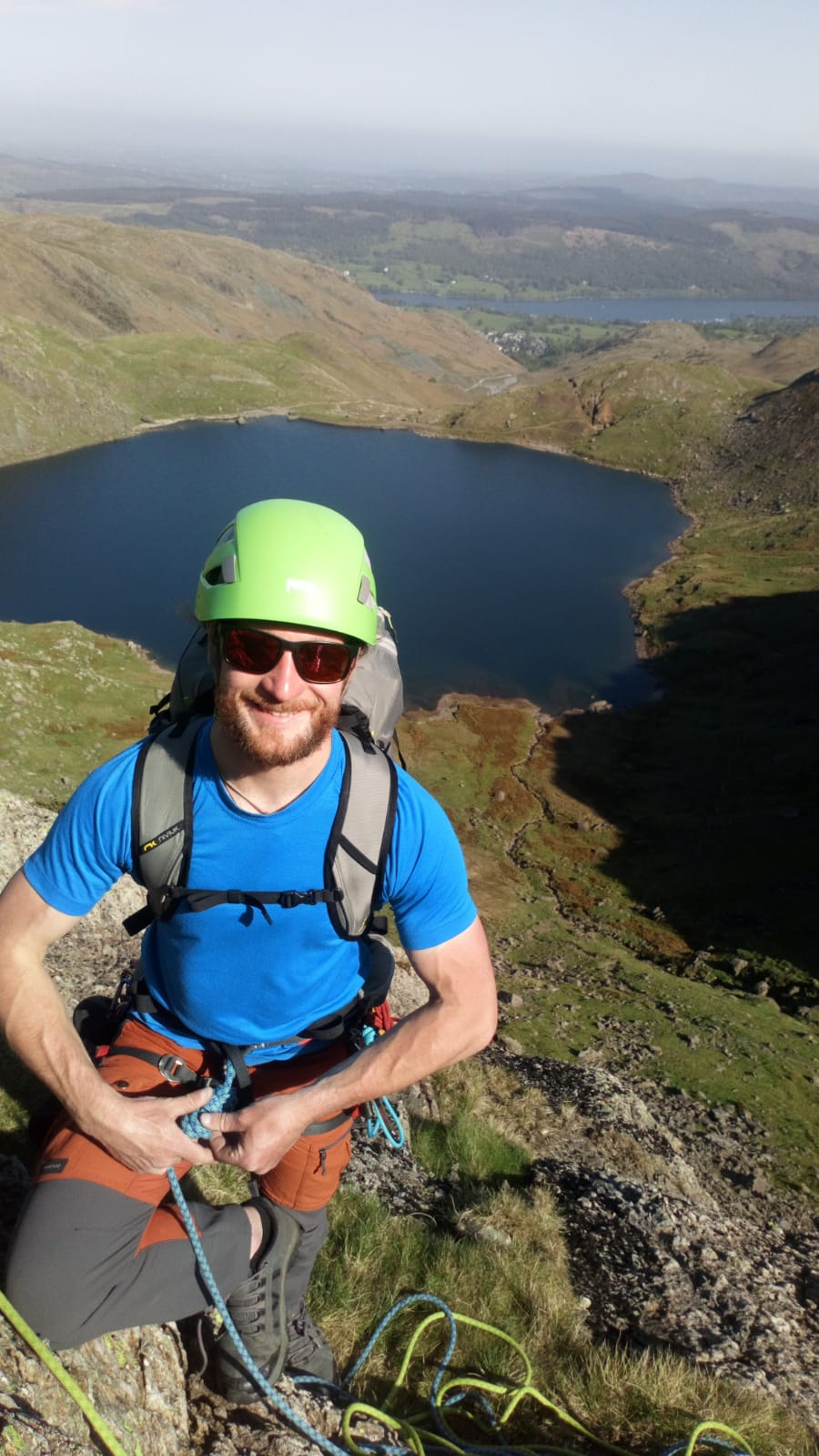 Matt and I set out to climb the enjoyable slabs of Little How Crag and hoped to crest the ridgeline towards the end of the day so that Matt could hopefully Para-glide off whilst I strolled back. The crag is situated above the northwestern shore of Levers Water and soaks up a full days sun. We climbed at a leisurely pace on sunny slabs with fabulous rock to complete 3 routes; S, HS, VS, respectively. The last route was completed with all our gear backpacked in order we get to the ridge in good time. It was great to watch Matt come into view, or rather his giant Para-sail Pack, emerging from the airy depths below like a sun-kissed ninja-turtle hero. Knowing how rare and special it was to climb a Lakeland crag in a t-shirt and free of the midge blight, we were now feeling energised to get Matt in the air. We set off for the grassy western top slope of Savin Hill just north of the Old Man of Coniston where Matt hoped for favourable launch terrain and thermal conditions.
